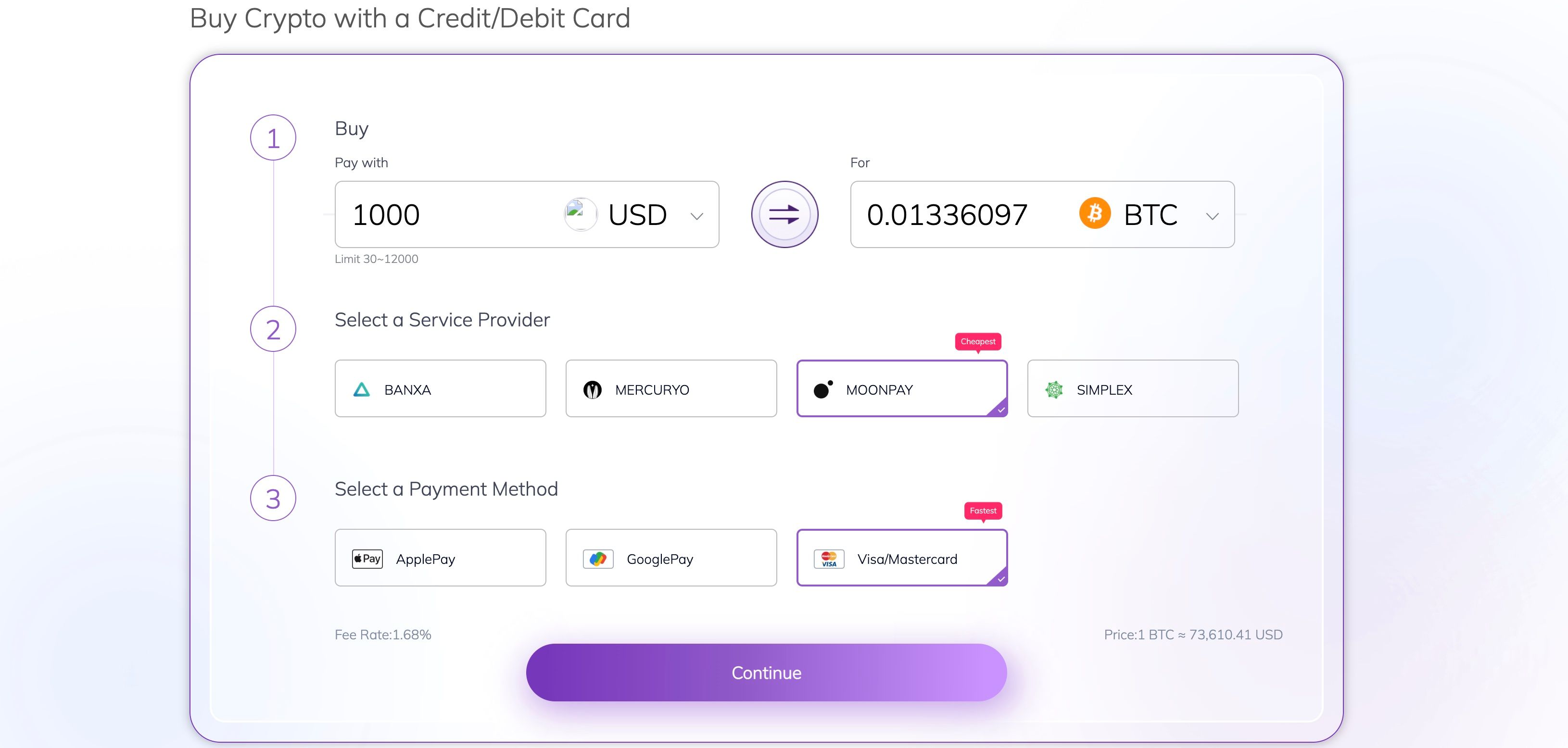 For App Client: Tap [Buy Crypto] on the homepage to enter the purchase page and select a payment method.