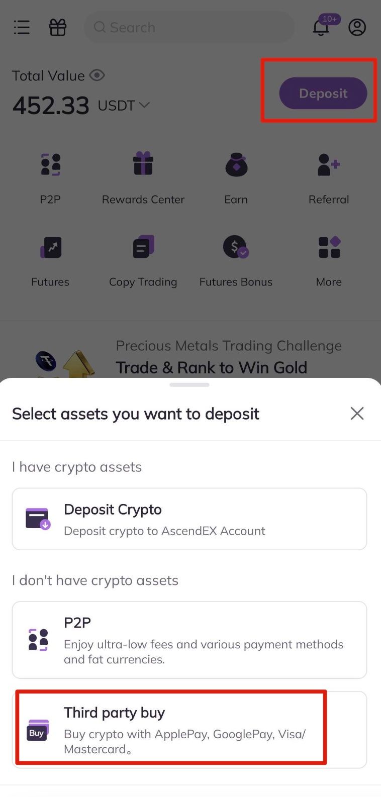 1. Log in to your AscendEX account on your app and click [Deposit] on the homepage, then select [Third party buy]