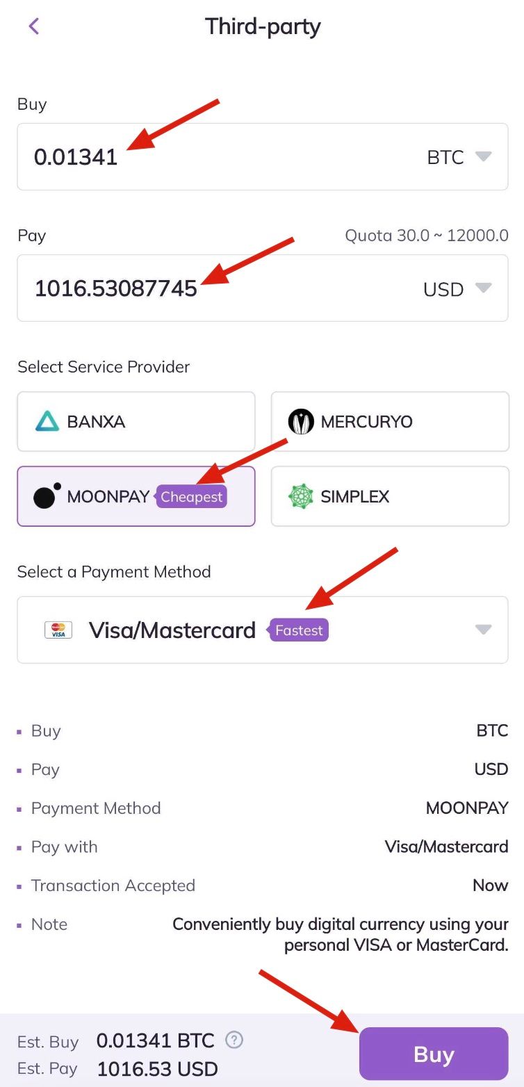 8. Confirm your payment details, check MoonPay’s Terms of Use and click [Buy Now].