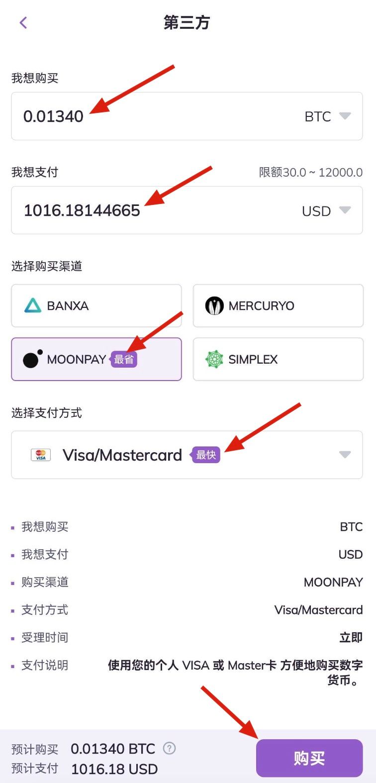 2.进入买币页面,选择想要购买的币种和用以支付的法币,填入对应的法币总金额,选择支付渠道MoonPay和MoonPay支持的支付方式。确认购买币种数量和法币总金额信息后,点击页面最下方购买按钮。