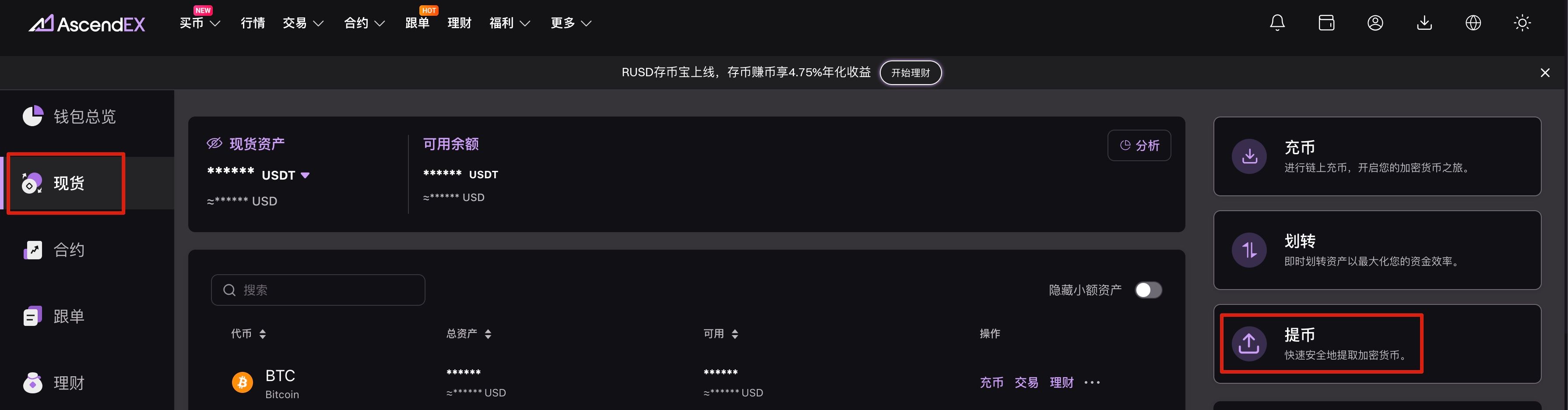2.点击我的资产,进入现货钱包页面。