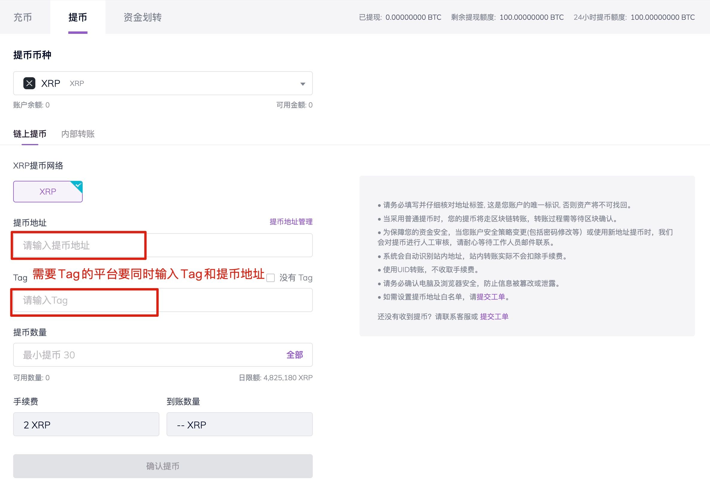 6.如选择提现数字货币,您需要至需要充值到的平台或钱包获取充币地址,填写到提币地址处,如果选择提现部分数字货币,(如RIPPLE主网充值XRP)一些需要Tag的平台要同时输入Tag和提币地址,因遗漏Tag导致资金丢失将无法找回(不需要Tag的平台可以点击没有Tag)。