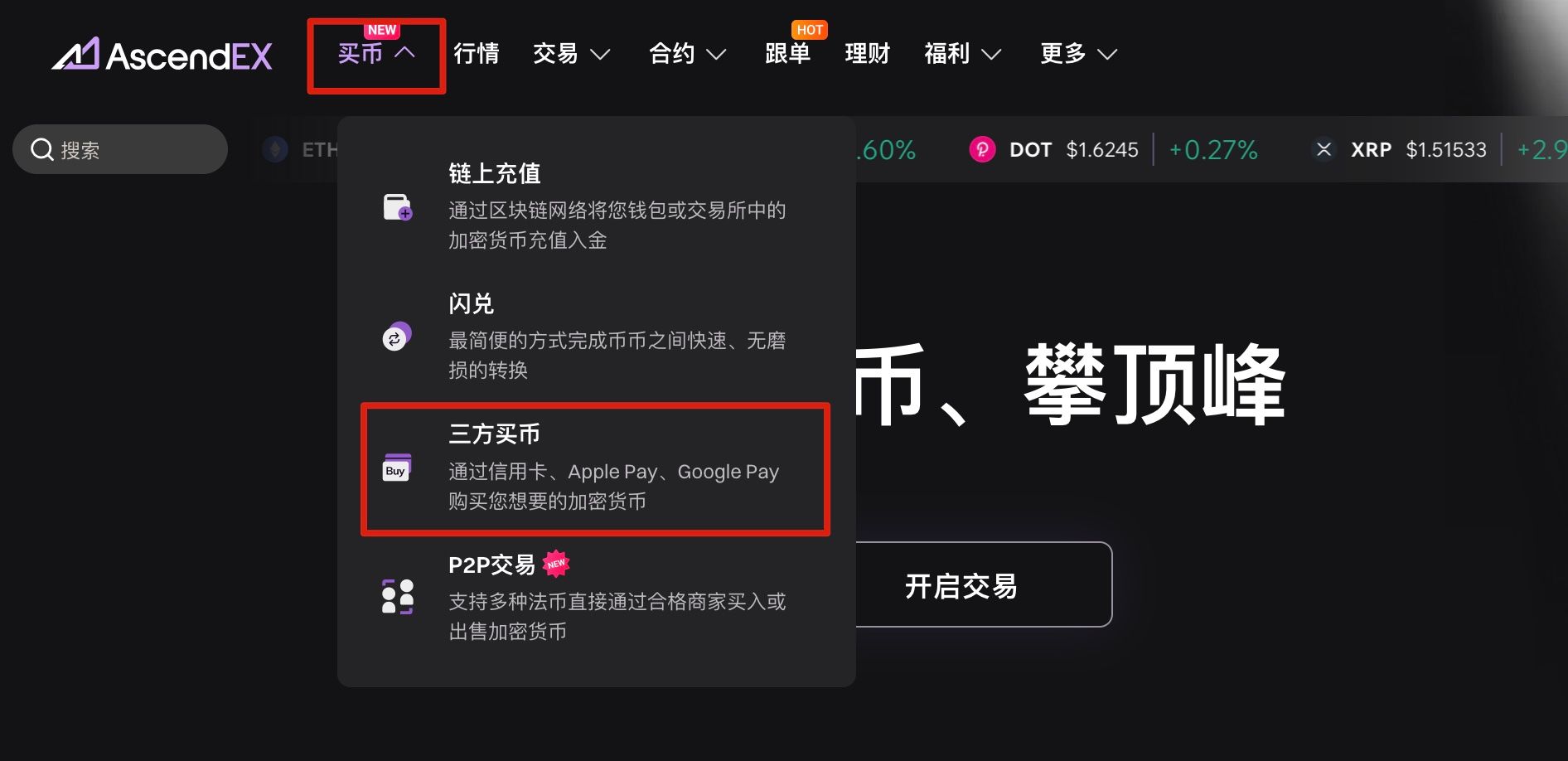 1. 登录AscendEX官网,点击首页左上方买币,选择三方买币。