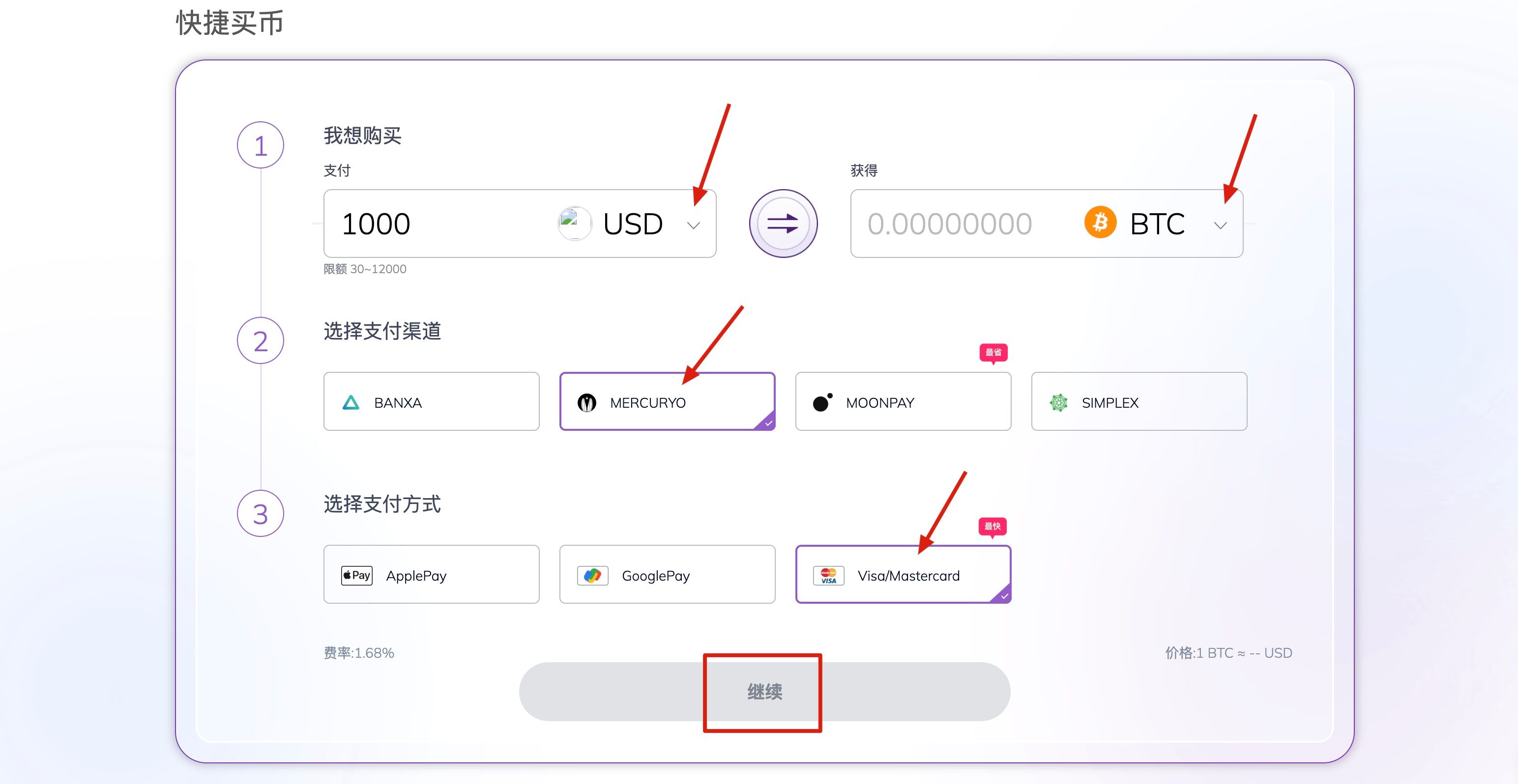 2.进入快捷买币页面,选择想要购买的币种和用以支付的法币,并填入对应的法币总金额,选择支付渠道mercuryo和mercuryo支持的支付方式,任意选择其中一种。确认购买币种数量和法币总金额信息后,点击页面最下方的继续按钮。