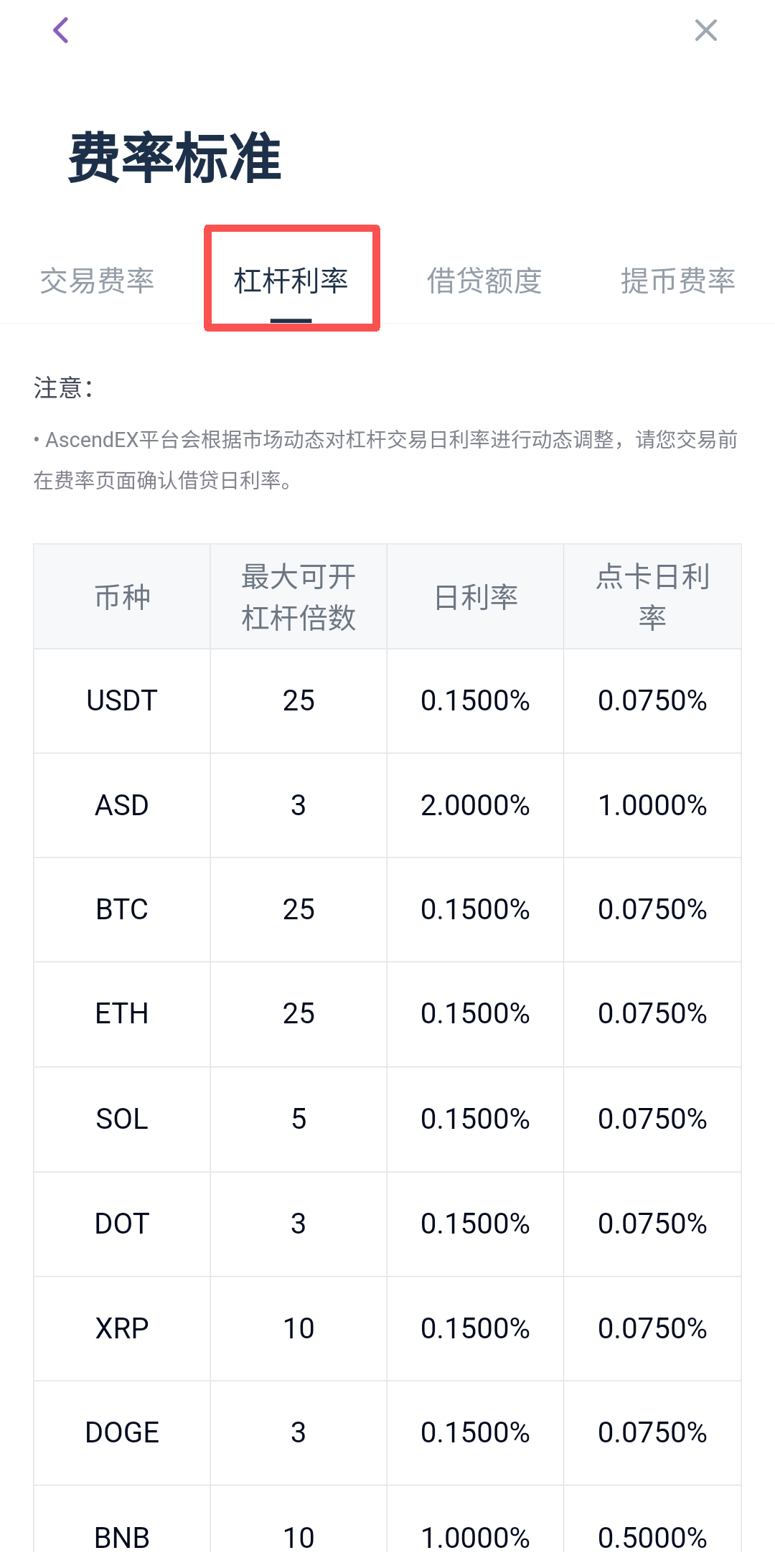 3.进入费率标准页面,点击杠杆利率,即可查询各币种最大可开杠杆倍数、日利率及点卡日利率信息。
