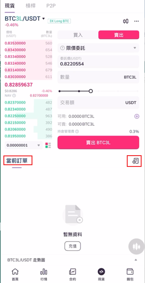 8..以賣出BTC3L為例,點擊賣出按鈕,選擇訂單委託類型,輸入BTC3L賣出價格及數量,或直接拖拉額度佔比線條輸入交易數量及對應交易總額。確認無誤後,點擊下方賣出BTC3L按鈕。