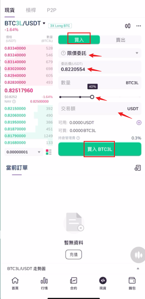 7.以買入BTC3L為例,在買入交易操作區域,選擇訂單委託類型,輸入BTC3L買入價格及數量,或直接拖拉額度佔比線條来輸入交易數量及對應交易總額。最後,確認訂單信息無誤後,點擊下方買入BTC3L按鈕。